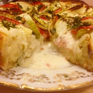 When the dough has risen a second time, start 'assembling' the pie. I divided the dough into 8 balls, rolled each one out, spread with butter, and stacked them in a round form, adding garlic cream and vegetables on top. Bake in the oven at 356°F for 30 minutes. Remove the pie, sprinkle with fresh herbs and lemon pepper.