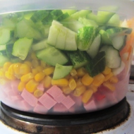 Boil the eggs hard, wash the bell pepper and cucumber in cold water, and drain the corn.