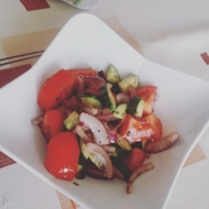 The amount of ingredients for the dressing can be adjusted to taste, making it more sour, sweeter, or more neutral. This salad is especially delicious if it sits in the refrigerator for a while — the tomatoes will release juice, making the dressing even tastier.