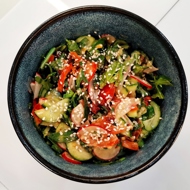 Dress the salad with the resulting sauce and toss. Sprinkle with sesame seeds and serve.