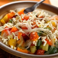 In a small skillet, heat 2 tablespoons of oil and add the garlic – sauté over low heat, stirring, for a few minutes until the garlic begins to darken. Add it to the vegetables along with the oil just before everything is ready.