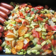 Then add the chopped tomatoes to the vegetables, mix again, and leave the mixture for another 20 minutes (depending on your oven).