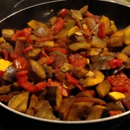 Add the zucchini, squash, eggplant, and onion to the pan, sauté for 7-10 minutes over medium heat, stirring constantly.