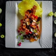 Add the fried tofu to the sautéed vegetables and the sweet and sour sauce.