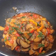 Cut the peppers and eggplants into medium-sized slices.