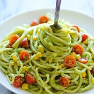 Add the resulting mixture to the spaghetti along with the corn, cherry tomatoes, and olive oil. Toss to combine.