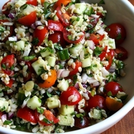 Finely chop the red onion, 5-6 green onion stalks, a bunch of chives, and 1 long cucumber. Cut 1-2 handfuls of cherry tomatoes in half or quarters. Chop 1 bunch of parsley (and you can also add a handful of mint leaves).