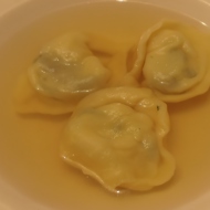Roll out the dough into a very thin sheet, cut into squares measuring 7 cm. Place one teaspoon of filling in the center of each square and fold into a triangle. Seal the long ends together to form a crescent shape. Cook the tortelli in the broth until done and serve with the broth.