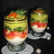 In the glasses with the cheese mixture, layer the fish with the bell pepper, then the cucumber with dill, and the last layer is the avocado cream.