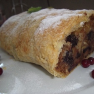 The strudel is served warm, dusted with powdered sugar, and pairs well with a scoop of ice cream or vanilla sauce.