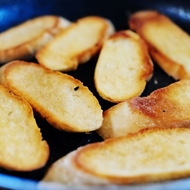 Spread vegetable oil on the baguette slices, top with the seasoned red pepper and wine vinegar.
