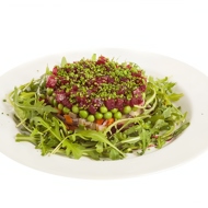 Using a culinary ring, layer the beetroot, then the vegetable mixture, followed by the peas. Drizzle with sauce and finish with a layer of beetroot. Arrange the arugula leaves beautifully around the dish, sprinkle with scallions, and serve.