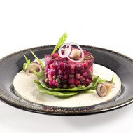 Place the spinach leaves on a plate, then use a culinary ring to shape the vinaigrette on top of the leaves. Garnish with slices of herring and rings of onion.