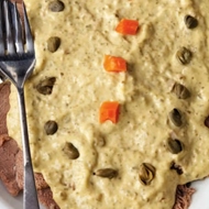 Thinly slice the veal and drizzle with the sauce. Garnish with chopped carrots, capers, parsley, lemon, and olives.