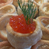 Place a piece of butter in the center of each vol-au-vent. Then add a small dollop of jam, followed by the caviar, and garnish with dill.