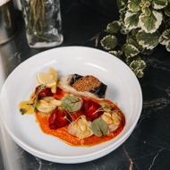 Assemble the dish. Place the warm romesco sauce in the center of the plate, topped with the Volga catfish, and arrange a salad of homegrown cherry tomatoes, roasted bell peppers, grainy mustard, and a wedge of lemon alongside.