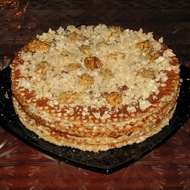 Spread condensed milk on the top layer, sprinkle with crushed waffles, and decorate with halves of walnuts.