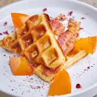 Place 2 waffles on a plate, drizzle with honey, top with cottage cheese, fresh persimmon, and slices of fried bacon.