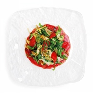 Arrange the dressed ingredients on the carpaccio, garnish with confit tomatoes, drizzle with aged balsamic vinegar, and sprinkle with freshly ground black pepper.