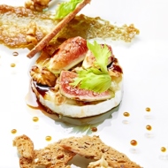 Place the baked cheese on a plate, garnish with celery leaves and watercress. Serve with fig jam and grain chips.