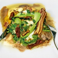 Then add the salad, almonds, tomatoes, mozzarella, and basil leaves to the skillet. Check for salt and pepper.