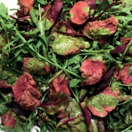 Warm Lamb Salad with Arugula, Beet Greens, and Cilantro-Mint Pesto