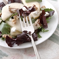 Warm Pear and Walnut Salad with Croutons and Roquefort Dressing