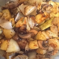 Wash the potatoes and cut them into 4–6 pieces. Peel the red onion and cut it into 4 pieces. Cut the fennel bulb into 8–10 pieces.