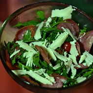 Toss the arugula with the tomatoes, add the dressing, and gently toss with your hands, then add the sausages and mix slightly. Top with shavings of Parmesan.