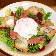 Warm Salad with Prosciutto, Poached Egg, and Goat Cheese