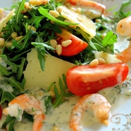 In a salad bowl, layer the arugula, chopped tomatoes, and shrimp. The sauce can be served separately, or the salad can be plated individually and drizzled with warm sauce.