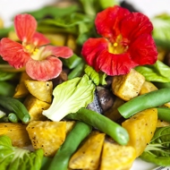 Sweet potatoes pair wonderfully with tangy dressings, which balance their pronounced sweetness. Portobello mushrooms are very aromatic and pair beautifully with potatoes. Edible nasturtium flowers add a delightful hint of spice. Tatsoi is a type of leafy cabbage, also known as spoon cabbage, Japanese spinach, Chinese cabbage, and a variety of bok choy.