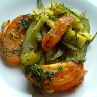 Slice the cucumbers into thin rounds (you can use a vegetable peeler), lightly sauté them over medium heat with a minimal amount of oil. Cut the tomatoes into wedges and sauté them as well.