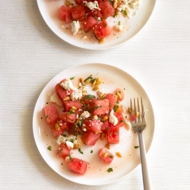 Wash the watermelon, dry it, and cut out the flesh. Slice it into large thin triangles, remove the seeds, and place them on the lettuce leaves.