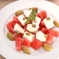 Add the watermelon, cubed feta, finely chopped olives, and finely chopped onion to the dressing. Gently mix, sprinkle with mint leaves, and serve.