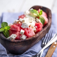 Crumble the feta cheese into small pieces and sprinkle it over the watermelon.