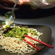 In any case, after the noodles are cooked, rinse them with cold water. Serve by mixing with the sauce. This dish is equally good with hot or cold noodles.