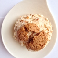 Remove the cream from the refrigerator, stir, transfer it to an ice cream maker, and churn according to the instructions for about 20-40 minutes. In the last minute of churning, add finely crushed amaretti cookies. At the end of churning, the mixture will resemble slightly softened soft serve ice cream. Fill a container with this mixture and place it in the freezer for 3-4 hours until firm.