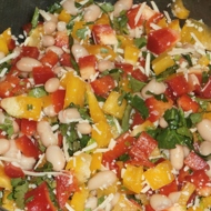 Mix the canned white beans, diced bell pepper, grated Parmesan, and chopped cilantro.