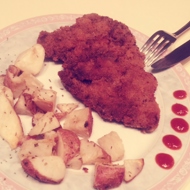 Take a tenderized piece of meat and coat it in flour so that it is completely covered. Now dip the floured piece into the eggs, allowing the excess to drip off. Then, coat it in breadcrumbs.