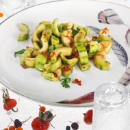Remove the seeds and inner membranes from the chili pepper and finely chop it. Add the ginger and chili to the chopped cucumbers.