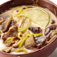 Remove from heat, take out the bundle of herbs, and season with salt to taste. Serve garnished with lime wedges.