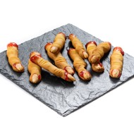 Insert an almond into one end of each sausage to make it resemble a fingernail.