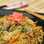 To prepare yakisoba at home: Cook the noodles for yakisoba in a separate pot until done or pour boiling water over them (according to the instructions on the package). Drain and let cool. Separate the chicken fillet from the bones and cut into small pieces.