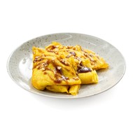 Some pancakes naturally have a golden hue, but this particular batch has a distinctly yellow color, which we achieved by adding turmeric to the batter. For these pancakes, we created a dessert filling of banana with peanuts and caramel sauce.