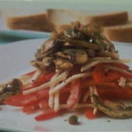 Julienne the bell pepper and celery root, combine them, dress with oil, season with salt and pepper, and mix well.