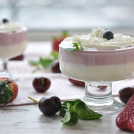 Spoon the plain yogurt into glasses, top with the blueberry yogurt, and garnish with whipped cream and blueberries.
