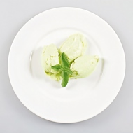 Using an ice cream scoop or a regular tablespoon, place three scoops of ice cream on each serving. Before scooping the ice cream, you can dip the spoon in a glass of warm water to help the scoops slide easily onto the plate. Garnish with fresh mint.