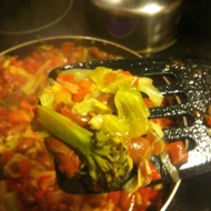 Chop the cabbage, slice the pepper, and separate the broccoli into florets. Add everything to the onion and sauté for 7-10 minutes until the first golden crust appears, then reduce the heat to medium.