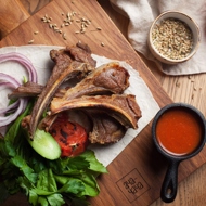 Transfer the cooked meat to a plate immediately, serving it with satsivi sauce, a halved tomato, and green onions.